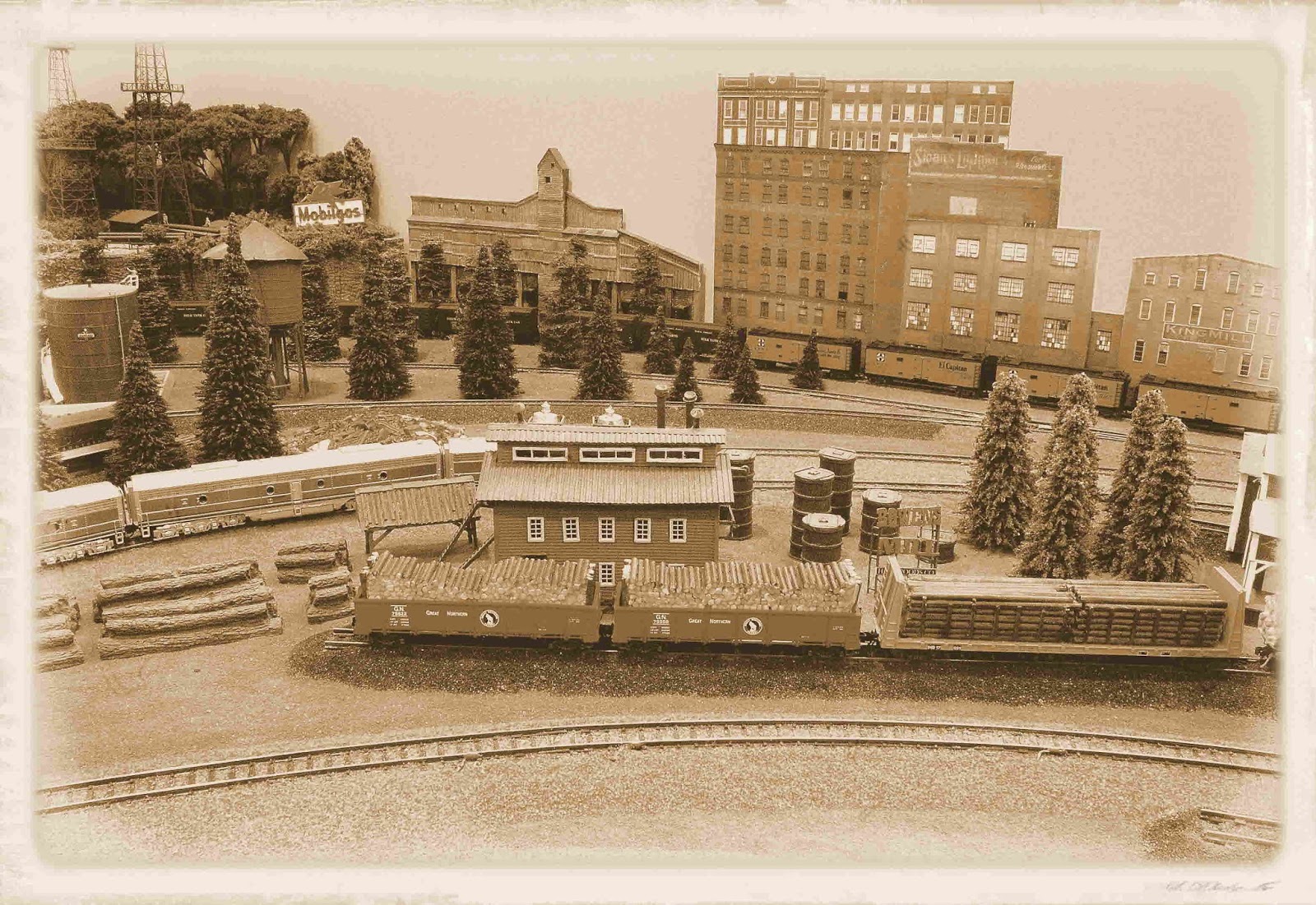 An old "albumen" closeup view of Bowdens Mills Lumber Yard west of San Marino. The sweeping curves on this part of the "new" JJJ&E utilize 30 inch radii. Two oil derricks are in operation above the retaining wall in this corner of the layout. A long Billboard reefer consist is on the outer mainline heading towards the Switching Yard. An "Albumen" photo is a paper based photo. Negatives were captured on glass and the print was created on paper using albumen from egg whites to bind light sensitive chemicals to the paper.