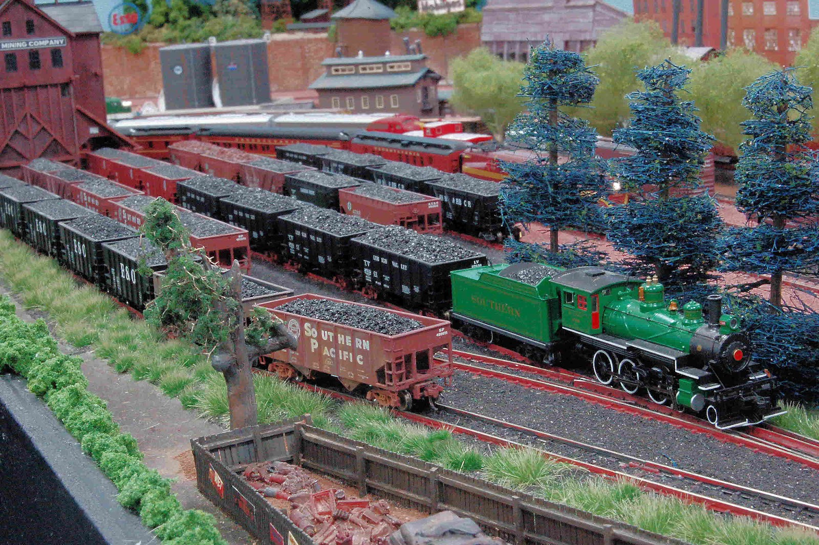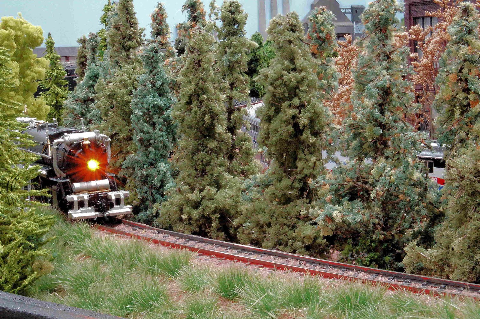 This layout has one forty foot 1 1/2% grade on the San Marino side of the layout. That grade allows me to run my steam locomotives of all sizes with a long string of cars depending on the steamer. I usually run consists of four diesels which pull 50+ cars easily.