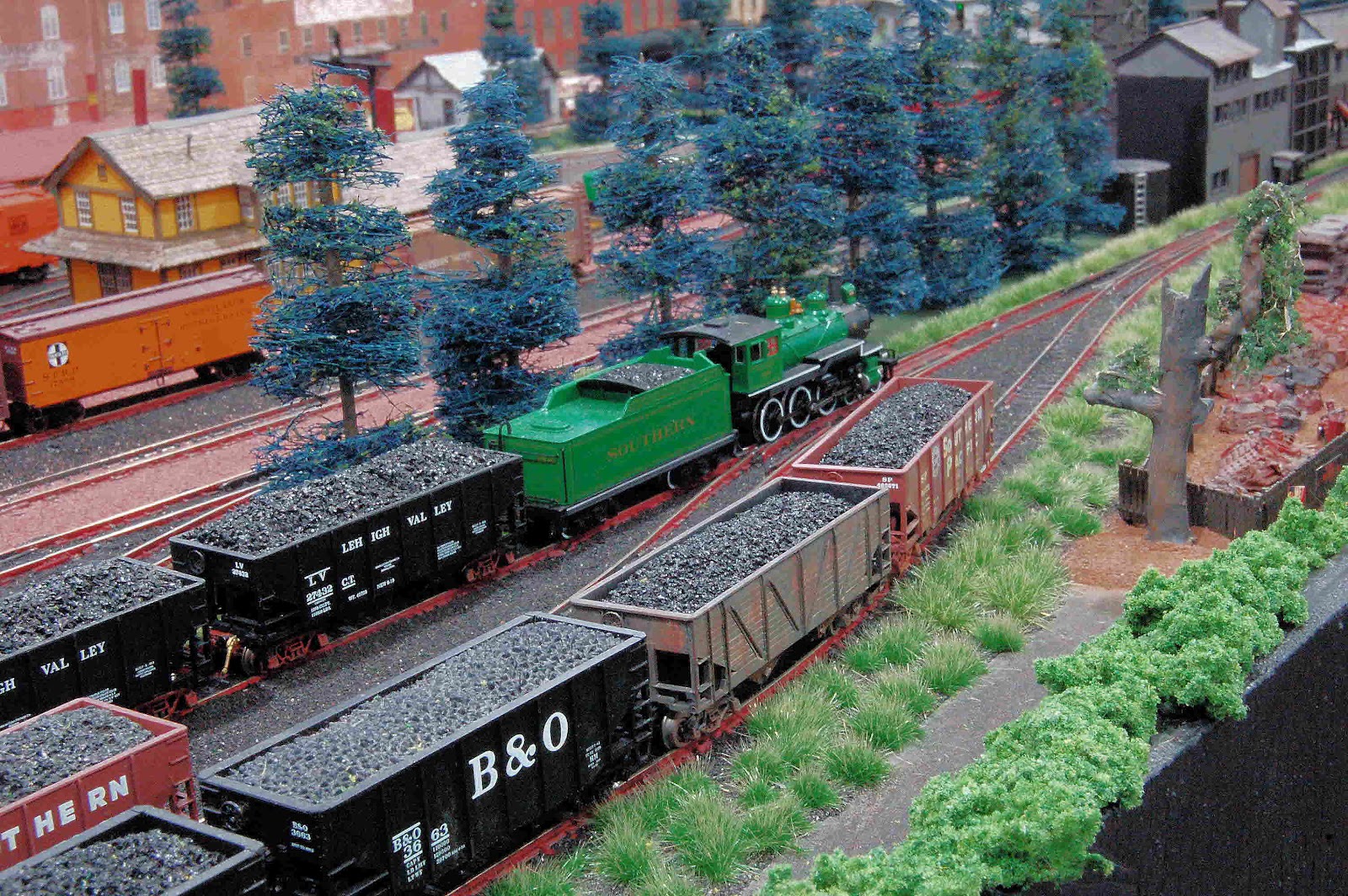 The Cash Coal Mining Facility is the largest industry on the "Mysterious" Middle Part Of The "New" JJJ&E. Five sidings hold all the 33' coal hoppers that are serviced by the Cash Coal Mining Facility The Southern 4-6-0 is pulling a string of 33' hoppers out of the siding. The Southern 4-6-0 has an ESU Lok-Sound Select Micro decoder and a Zimo cube speaker installed in the tender.