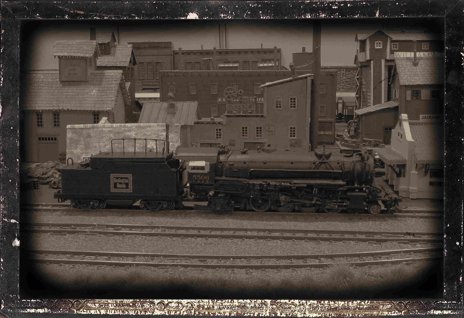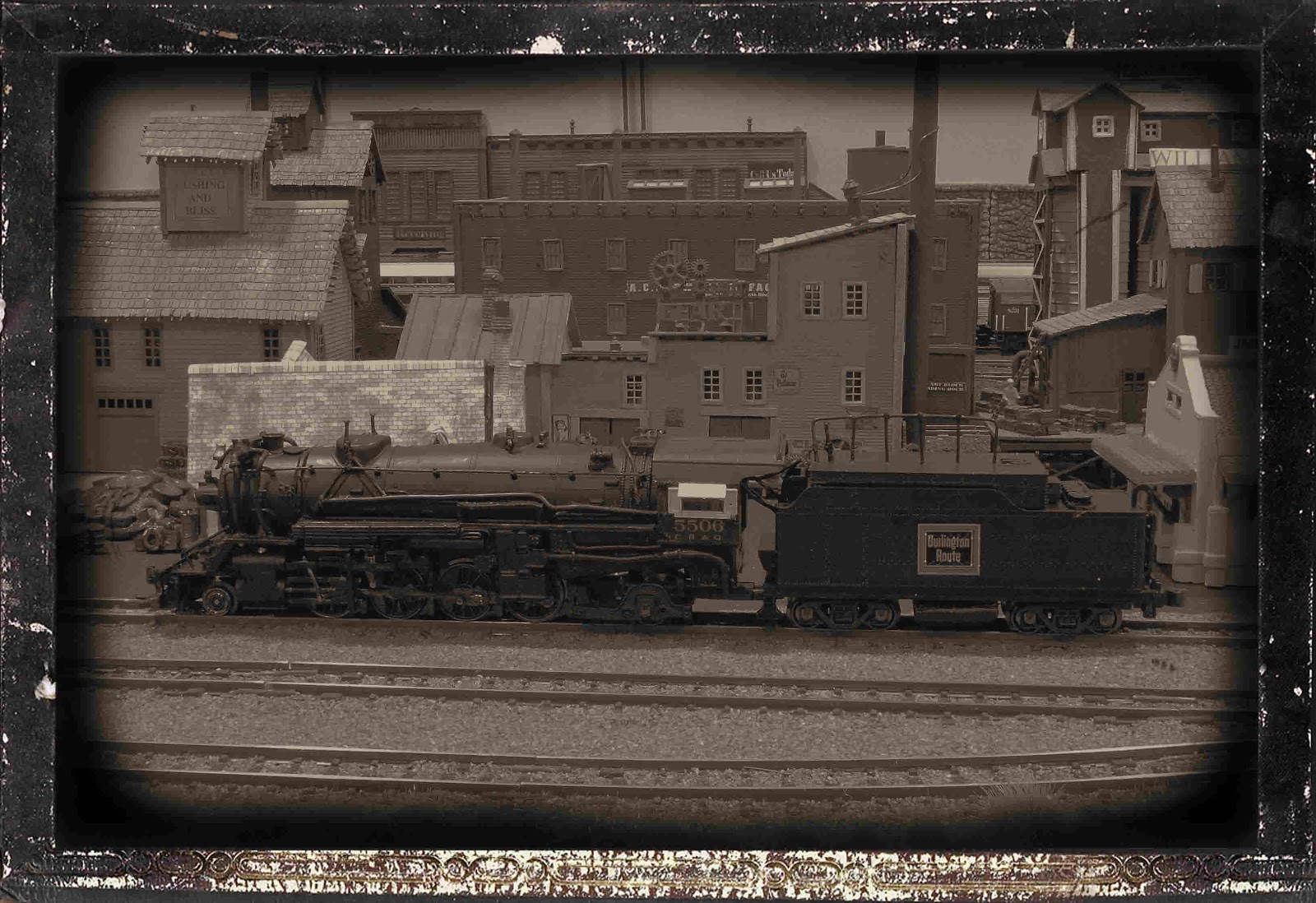 An old time classic photo of  a CB&Q 0-4 Mikado  # 5506 on the engineers side of the locomotive on the mainline in the center of San Marino. This locomotive was kit bashed from a generic Kato Mikado using a GHQ pewter detail kit. This steamer will pull over 50+ cars on level track due to the added weight of the pewter details