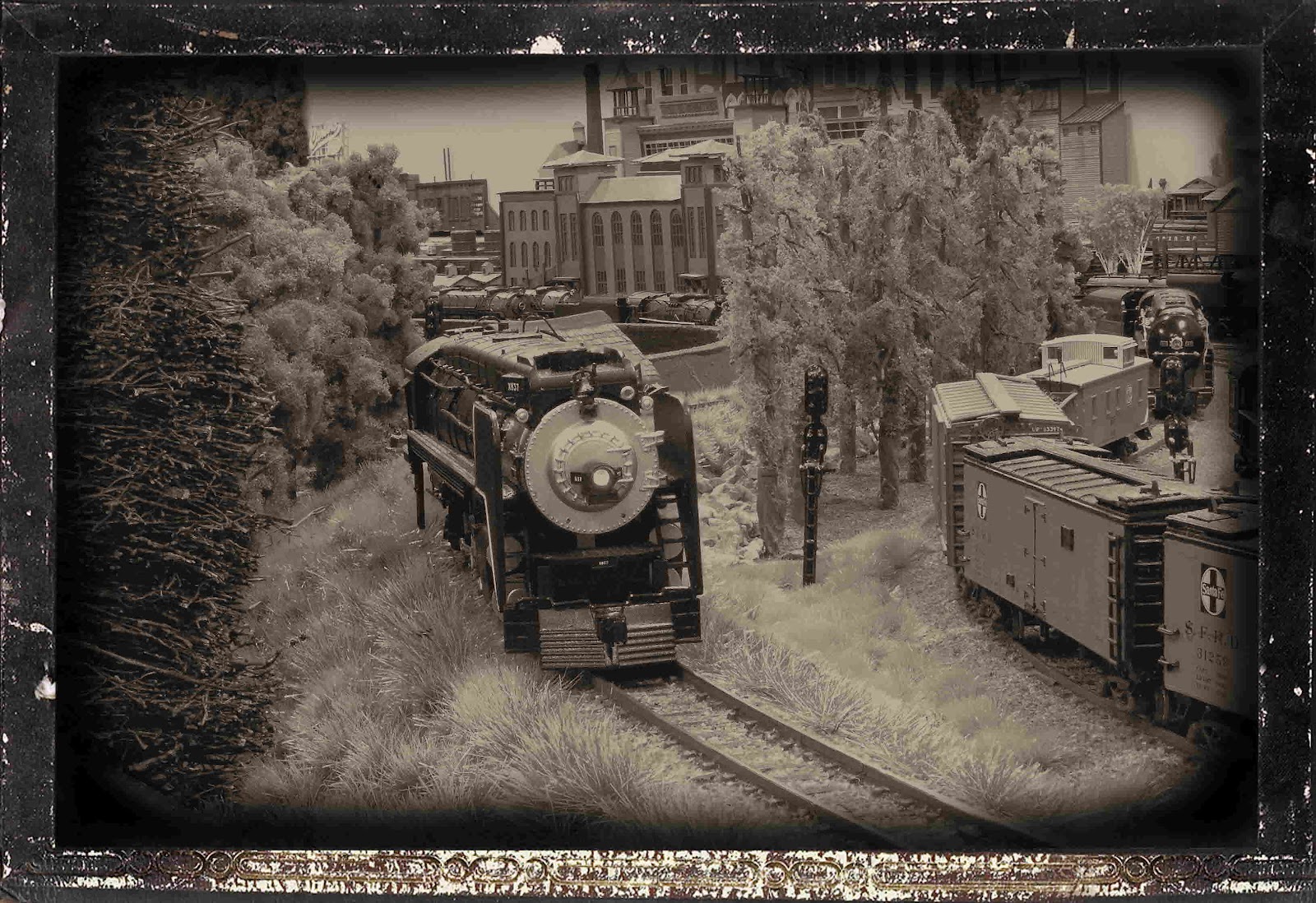 Yes there are diesels on the roster of the "new" JJJ&E. An old time classic photo of ATSF F-7's climbing the long 1 1/2% grade on the outer mainline track in the turnaround area east of San Marino. The Monterrey Mountains are in the distance. The Engine Maintenance Shop & Roscoe's Engine Shop are two of the buildings in the immediate background.