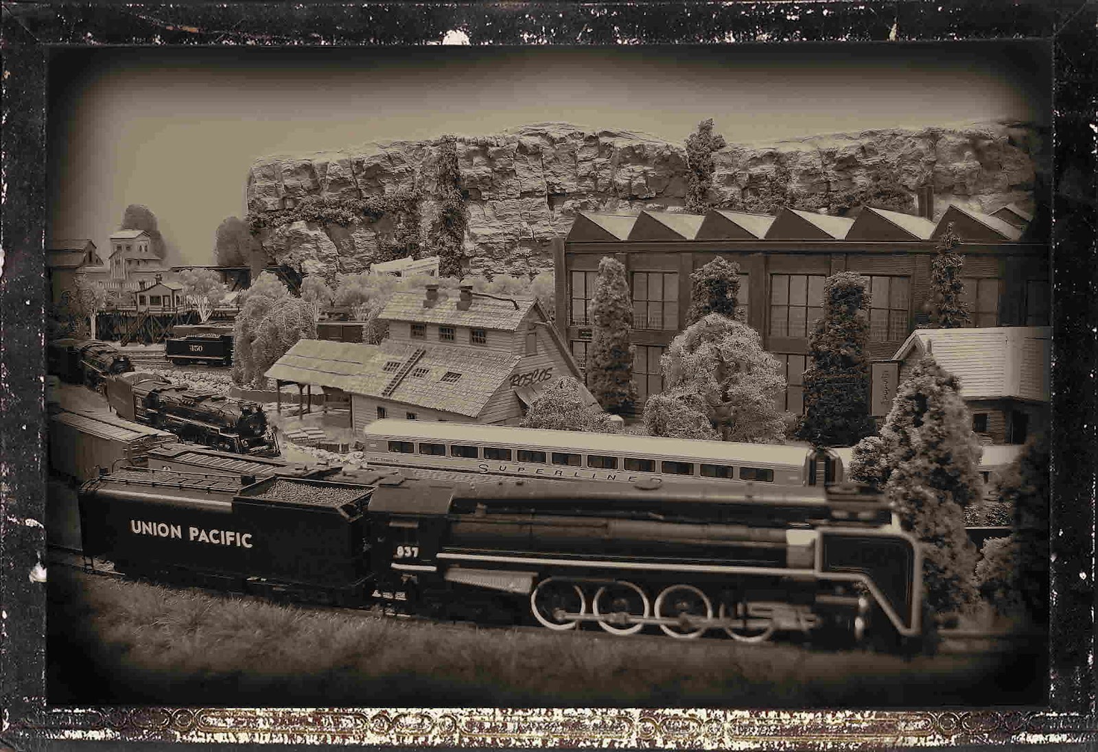 Classic Old Time Photo of  UP  4-8-4  #837 with smoke deflectors  on  one of the mainline tracks with the Switching Yard in the background.