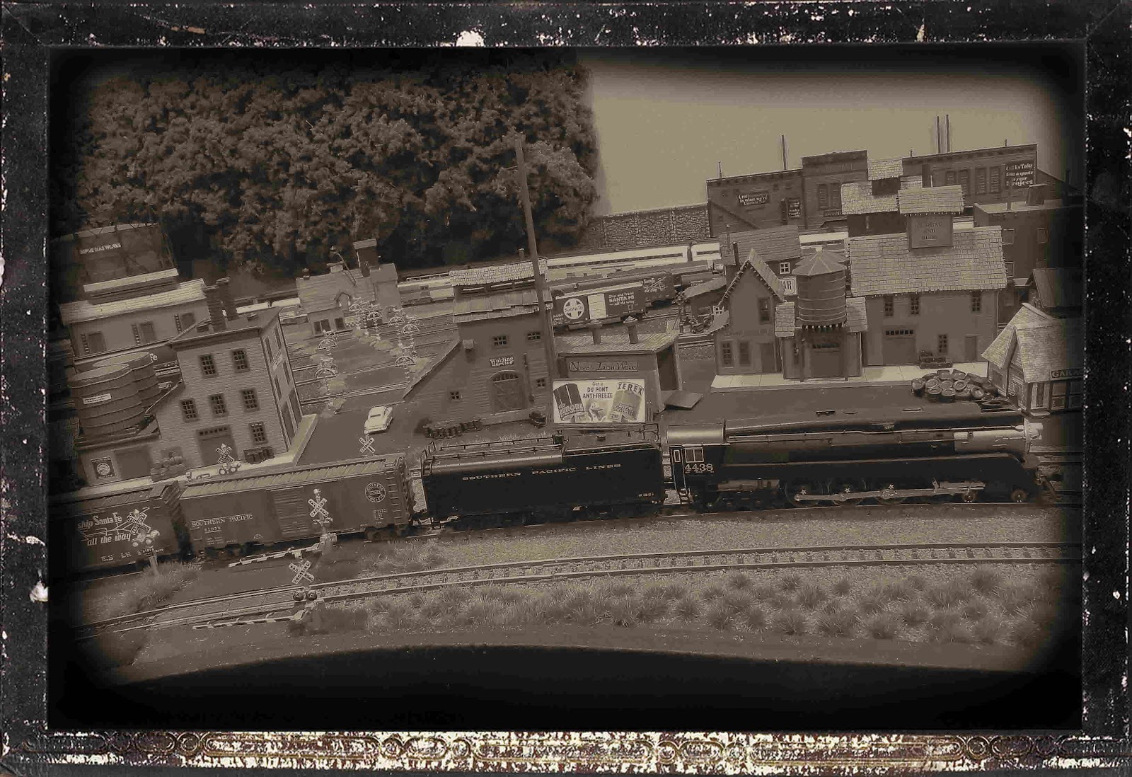 An old time classic panoramic photo of a SP Black GS-4 #4438 and its freight consist passing through a major railroad crossing in San Marino.