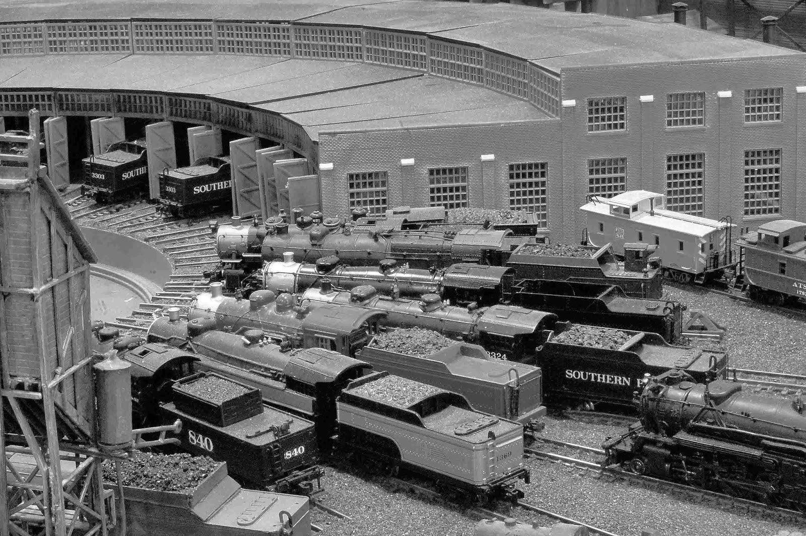 An old B&W photo of steam on holding tracks adjacent to the turntable and Roundhouse. There are ten holding tracks and two entry/exit tracks.