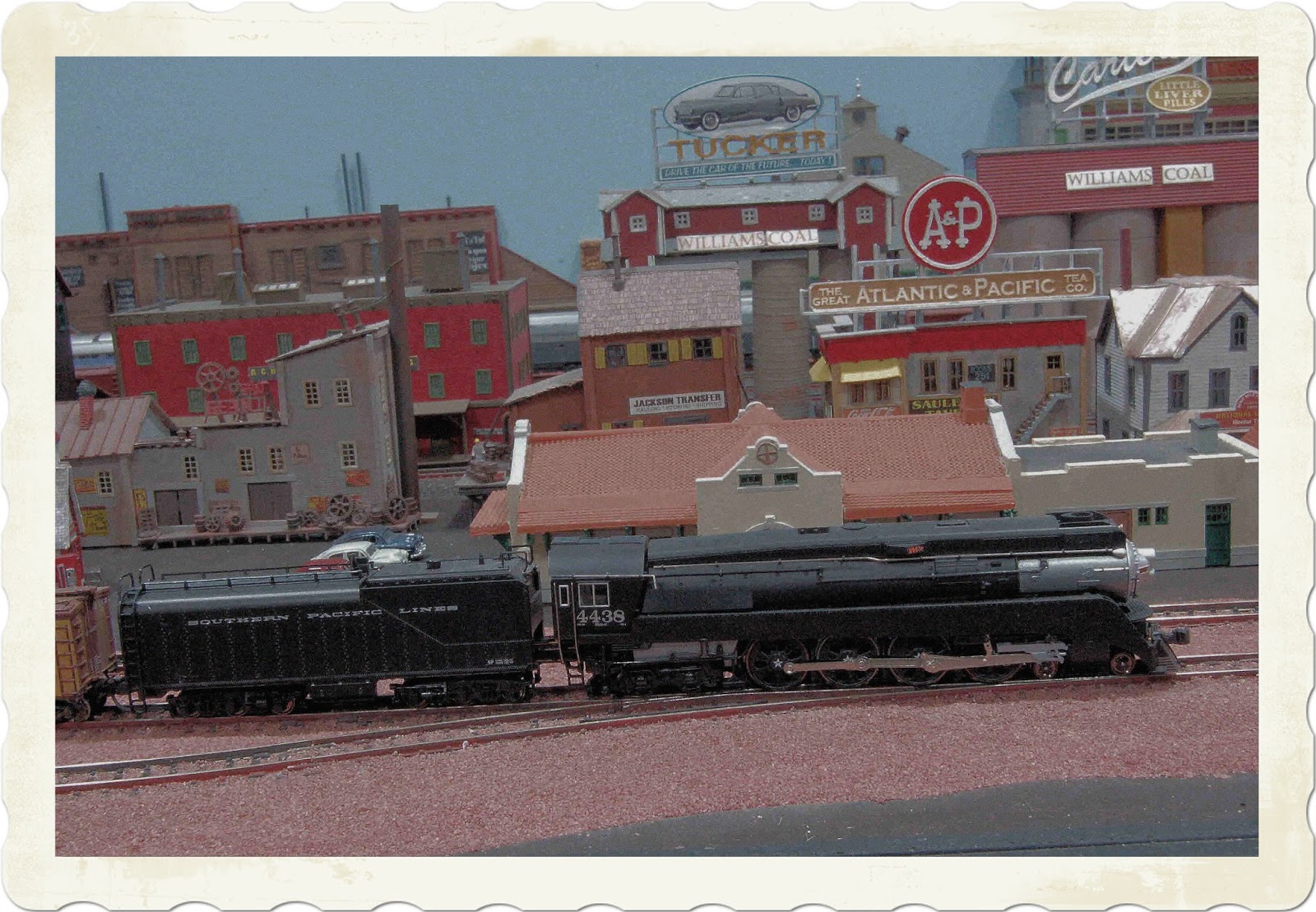 An old color photo (circa 1945)of a SP Black GS-4 #4438 pulling a consist of freight cars on the outer mainline track in the center of San Marino. During WW ll, SP painted all the "Daylight" GS-4's black so that they would be less noticeable from the air. After the war, the locomotives were again repainted in the "Daylight" colors.