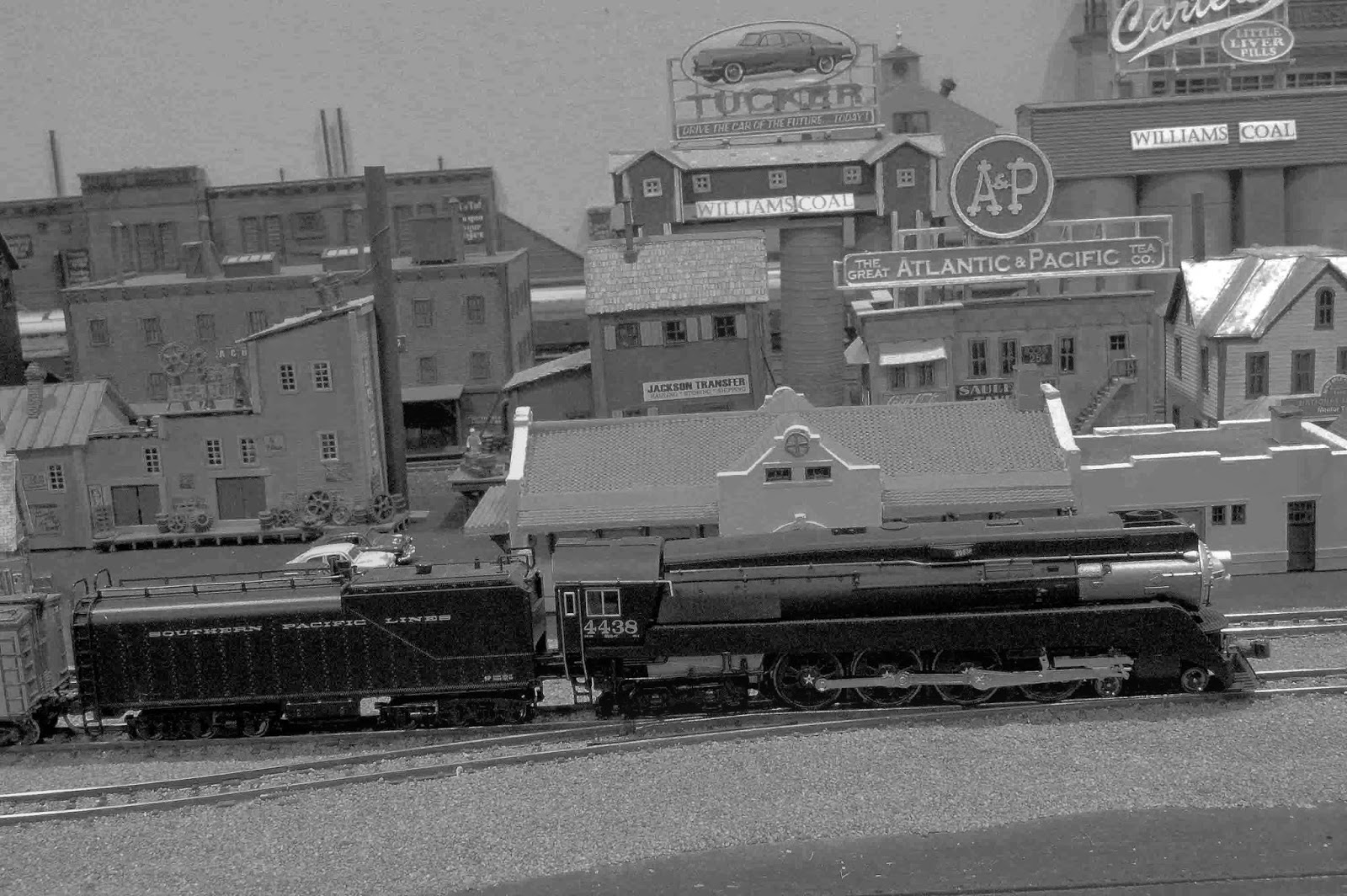 Old B&W photo of SP Black GS-4 #4438 pulling a consist of freight cars on the outer mainline track in the center of San Marino. During WW ll, SP painted all the "Daylight" GS-4's black so that they would be less noticeable from the air. After the war, the locomotives were again repainted in the "Daylight" colors.