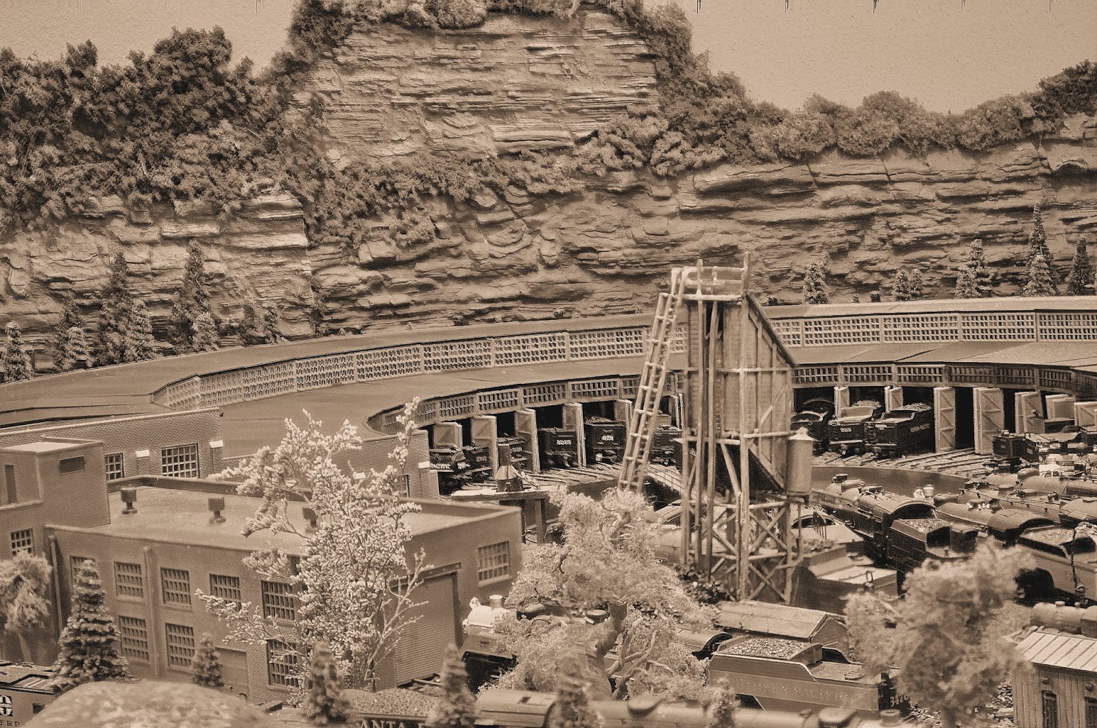I also used different rock formations behind the 24 stall Roundhouse in the 50 inch turnaround area. I also colored and weathered these formations.