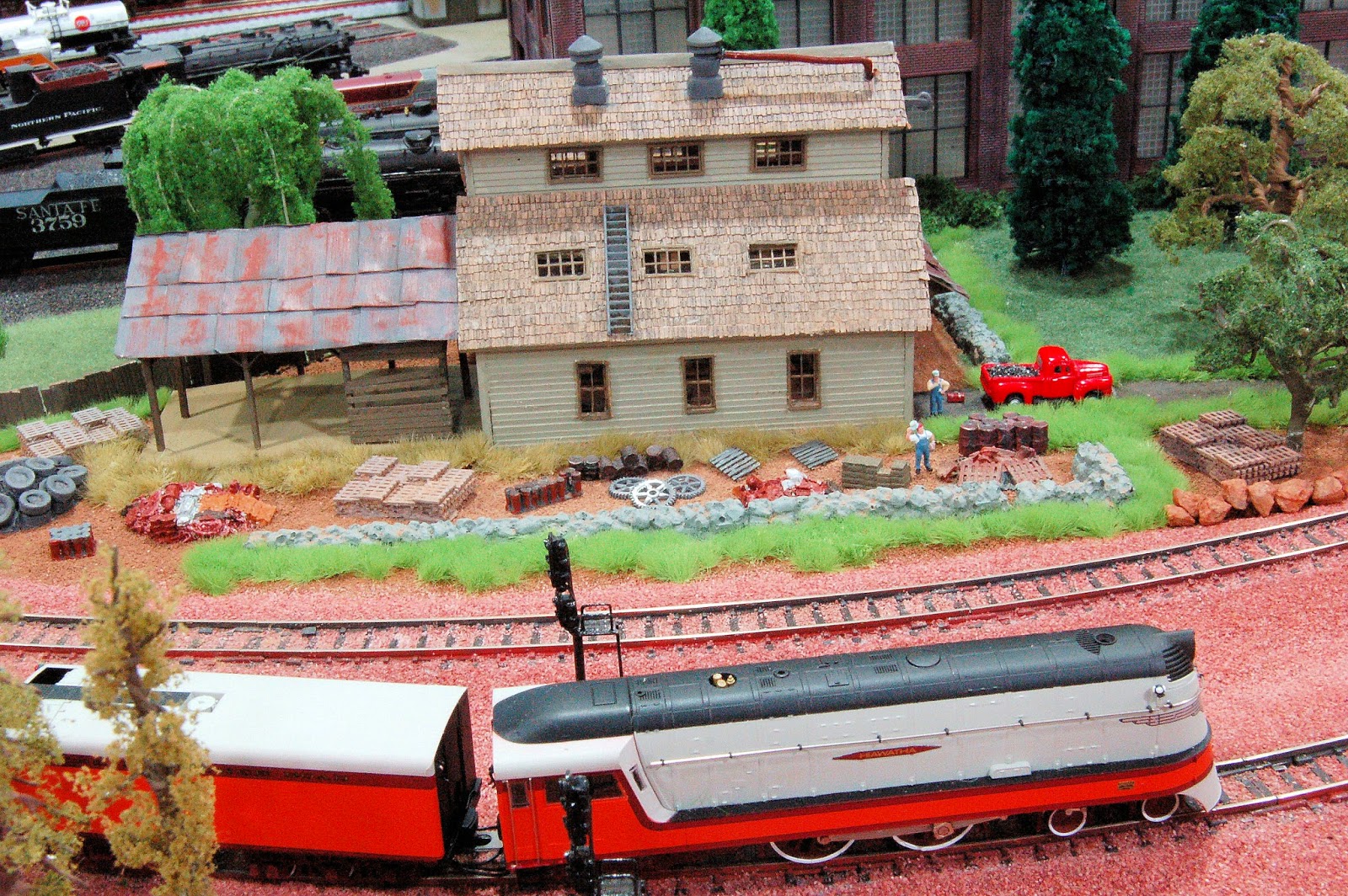 These are the two inner mainline tracks in the turnaround area east of San Marino. Large radii area a must on the "new" JJJ&E. This is a prerequisite for large steam locomotives to run flawlessly on the layout. A closer view of Milwaukee Hiawatha #1 with a direct view of Rosco's Engine Repair Shop. The Locomotive Maintenance Building is directly behind Rosco's Engine Repair.