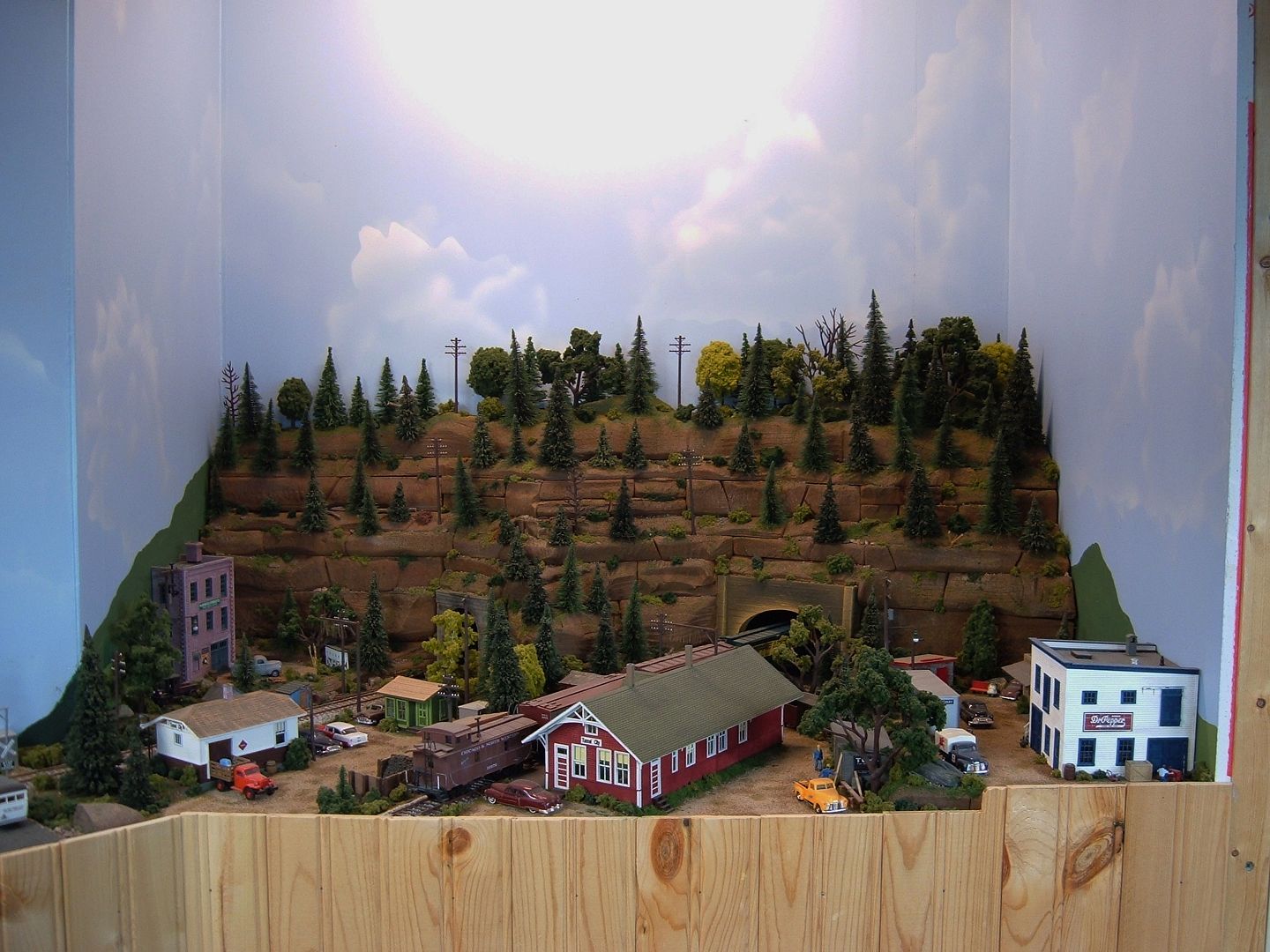 As I stated before the layout is in two rooms. The next section I built is 2' by 3' and is the town of Tunnel City and is the location of Milwaukee's first tunnel west. The CNW also had a tunnel here but in the 1970's the tunnel collapsed and was never reopened. They just joined to the Milw. tracks and rented their tunnel. The tunnel hides the wall opening between the two rooms. The only picture I can find of this section is a completed one.