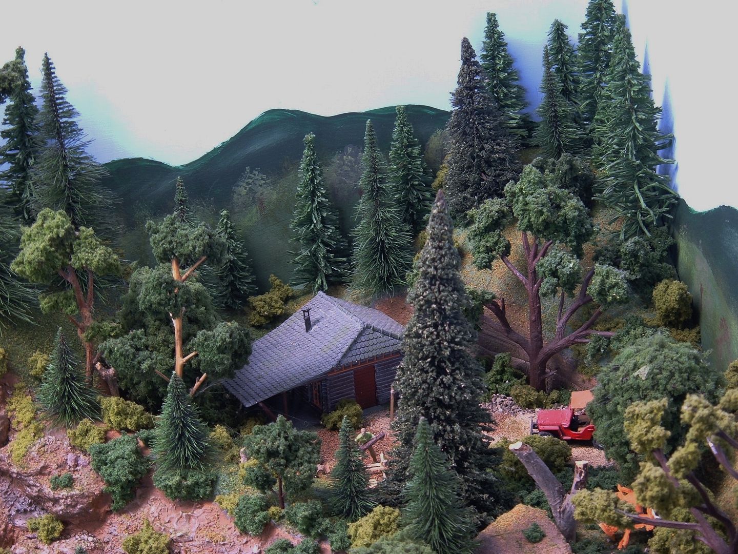 and here is the scene, cabin from a Faller kit, the jeep is ia Rocco military model redone and the LP are from Preiser.