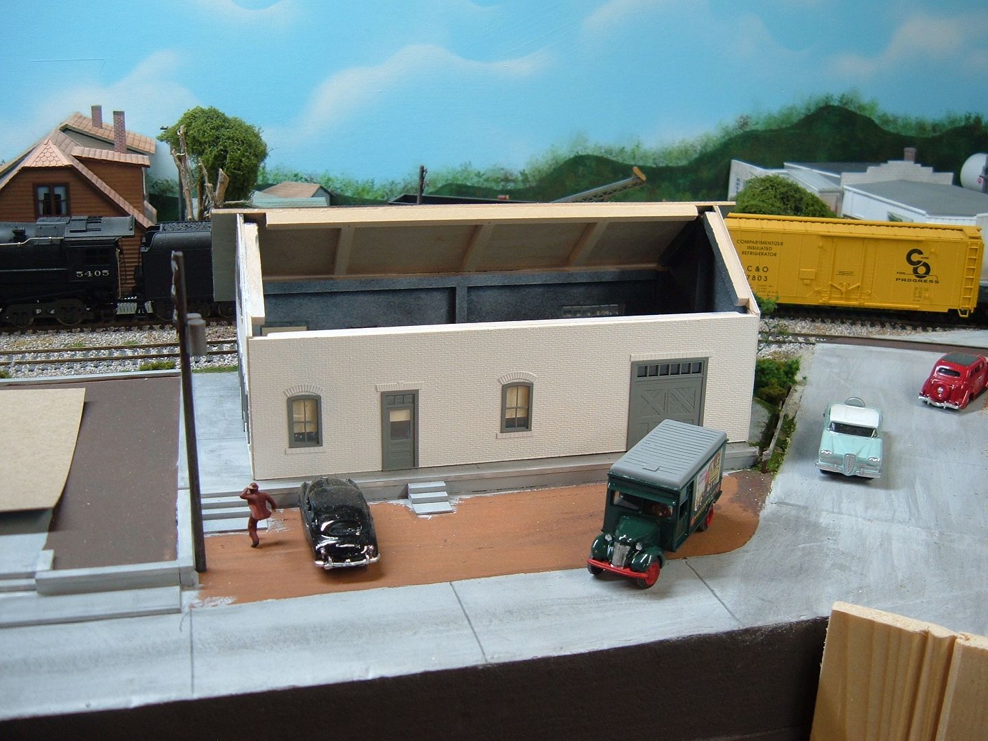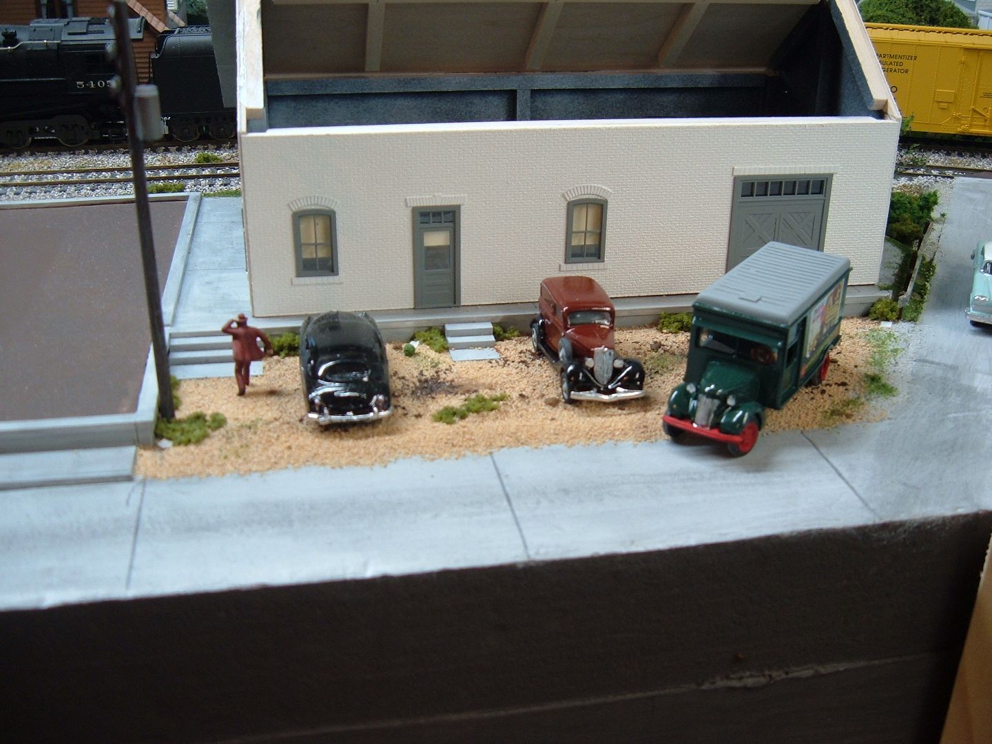 While I am waiting for the rest of the shingles to come in to finish the roof I have been working on the site. Added a few vehicles, power pole with transformers and a little guy that's running late. Working on one more car for the lot and then put down the gravel. I also have 9 more little people to paint.