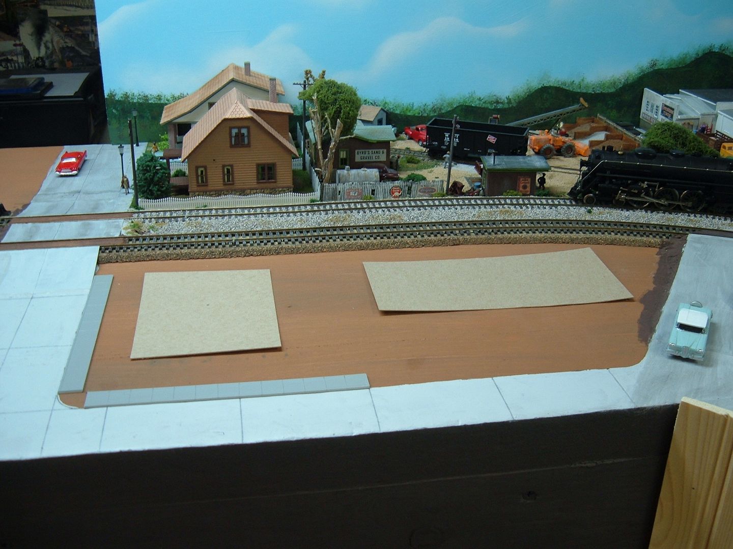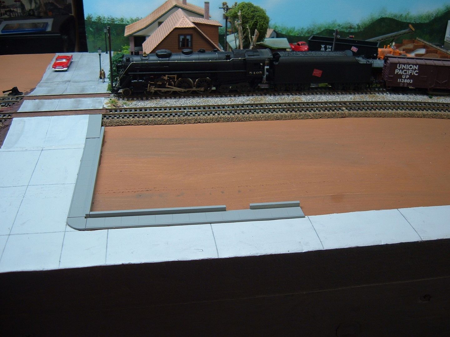 Finished the sidewalk and added a concrete retaining wall. now for some paint and weathering.