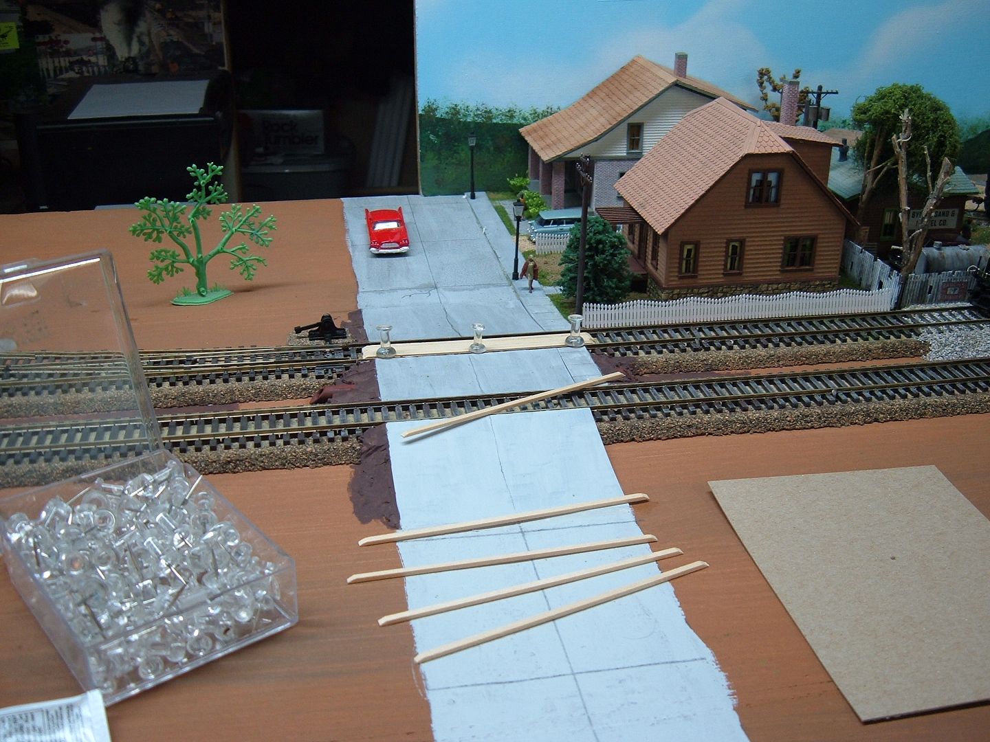 Finished the landscaping around the Solace house, added two street lights and a lady out for a stroll. Also started on the wood part of the crossing. I use 1/16 by3/32 basswood strips, cut to about two feet aside longer than the pavement. Five of these strips fit perfect between the rail with enough room for the wheel flanges. When They are all in I will use Apple Barrel acrylic oak stain on them then an A/I wash.  Then fill in the ballast and this scene is done.