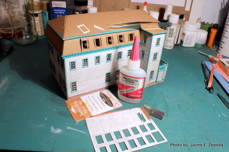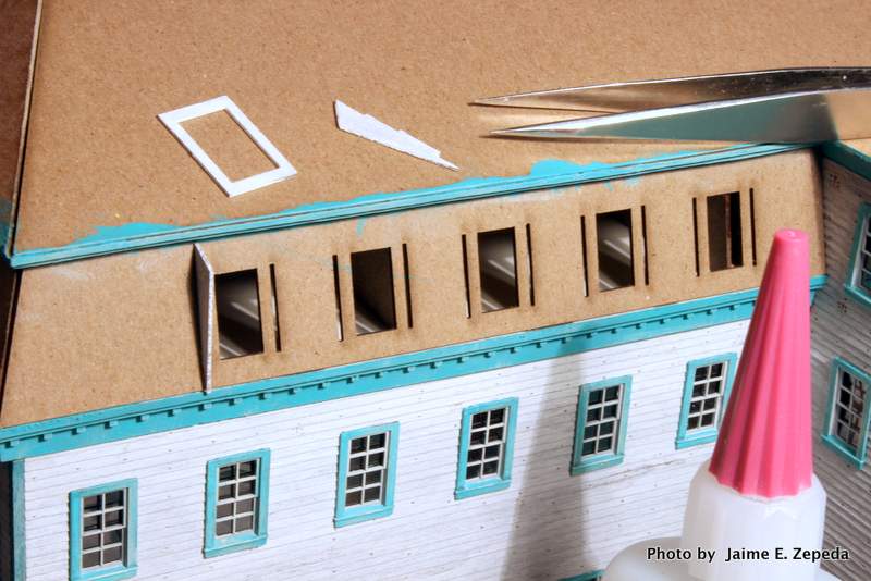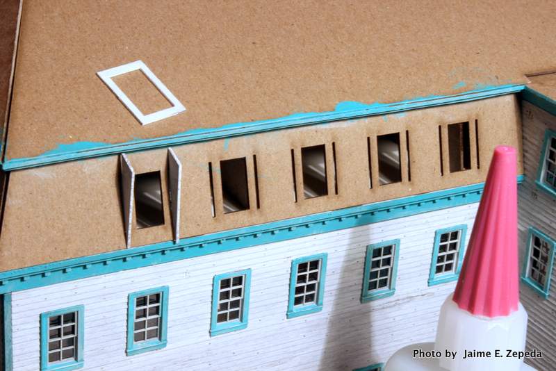 1. Using CA glue I glued the sides of the dormers first. Note there are slots in the mansard roof and tabs in the dormer sides. It is a very snug fit.