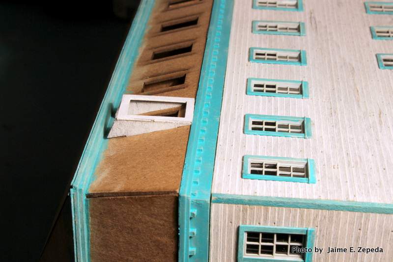 2. I cheated and placed the building on its side so I could glue on the dormer window openings onto the dormer sides.