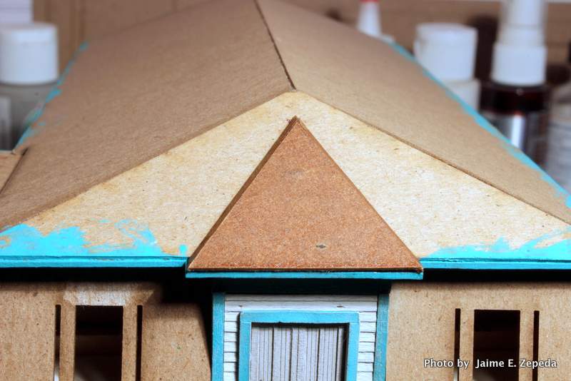 First of all, the dormers are made from laserboard. If you are not familiar with laserboard then pay attention. Laserboard is cardstock impregnated with resin. It is durable and cuts on the laser real nice. It is also a tad tricky to paint. Well, it was tricky for me to paint.